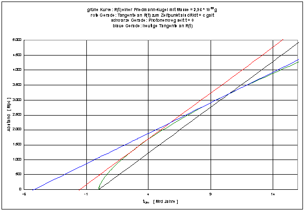 Die rote Gerade ist eine Parallele zur Lichtweggeraden. Ihr Schnittpunkt mit der grünen Kurve markiert den Schwarzschild-Zeitpunkt tS = 3,1 * 109 Jahre, zu dem die herausgefilterte Friedmann-Kugel gerade mit Lichtgeschwindigkeit c expandierte und ihr Radius dem Schwarzschild-Radius RS = 2MG/c2 = 1424 Mpc entsprach (vgl. mit dem vierten Aufsatz). Vor diesem Zeitpunkt war die Ausdehnungsgeschwindigkeit noch größer; sie war zur Zeit t = 0 sogar unendlich groß!
