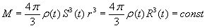 beschreibt die Friedmann-Gleichung eine sich mit der Zeit verändernde gleichmäßig und kugelförmig verteilte Massendichte r(t), wobei sich diese Dichte entsprechend des sich zeitlich entwickelnden Radius R(t) der Massenverteilung verändert. Da außerdem der Massenerhaltungssatz (I,5)