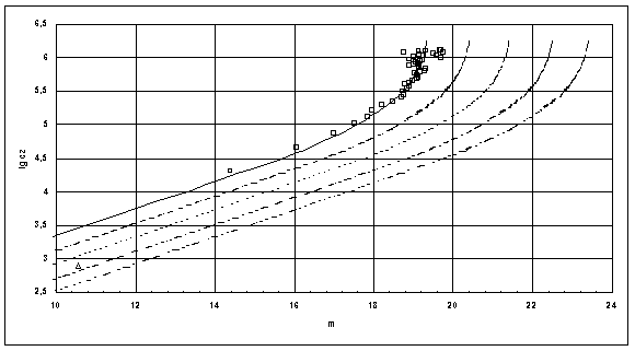 Für eine im Schnitt besonders lichtschwache extragalaktische Objektgruppe kann demnach die scheinbare Grenzhelligkeit im Hubble-Diagramm durchaus sehr weit rechts liegen. Das schließt aber nicht aus, daß sich einzelne Gruppenmitglieder im Hubble-Diagramm rechts von mA aufhalten können, ohne unendlich rotverschoben zu sein. So werden z.B. jenseits von mAQ = 19,46 die weniger leuchtkräftigen Quasare beobachtet [vgl. hierzu die Abb. I,3], deren Anzahl beträchtlich ist.